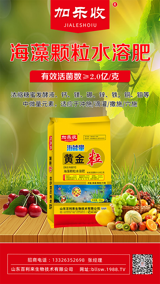 山東百利來生物技術(shù)有限公司【海藻顆粒水溶肥-黃金!渴歉鶕(jù)土壤多年連作重茬種植、施肥嚴(yán)重過量導(dǎo)致的有益菌過度消耗、土壤板結(jié)、鹽漬化,嚴(yán)重影響作物根系對(duì)土壤中養(yǎng)分的吸收利用。本品在研制中把氮、磷、鉀、中微量元素進(jìn)行合理配比,特別添加功能性有益菌群、海藻酸、海藻多糖、黃腐酸鉀、脯氨酸、聚谷氨酸等有機(jī)載體,應(yīng)用生物雙螯合技術(shù)螯合而成。
