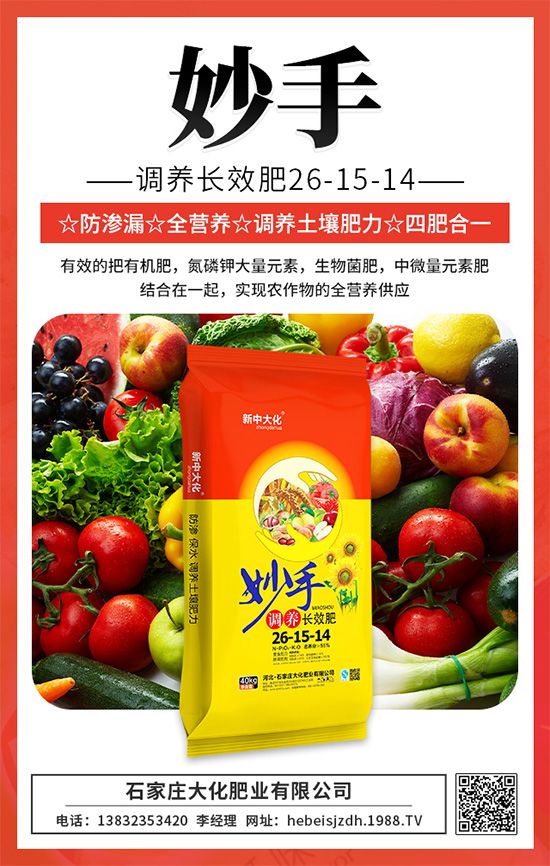 妙手調(diào)養(yǎng)長效肥,多種作物都能用,比同樣含量摻混肥控釋肥價格低,有賣點,利潤高,農(nóng)民說好,經(jīng)銷商賺錢多的好產(chǎn)品,值得你關(guān)注。