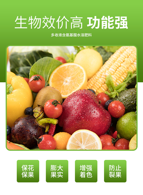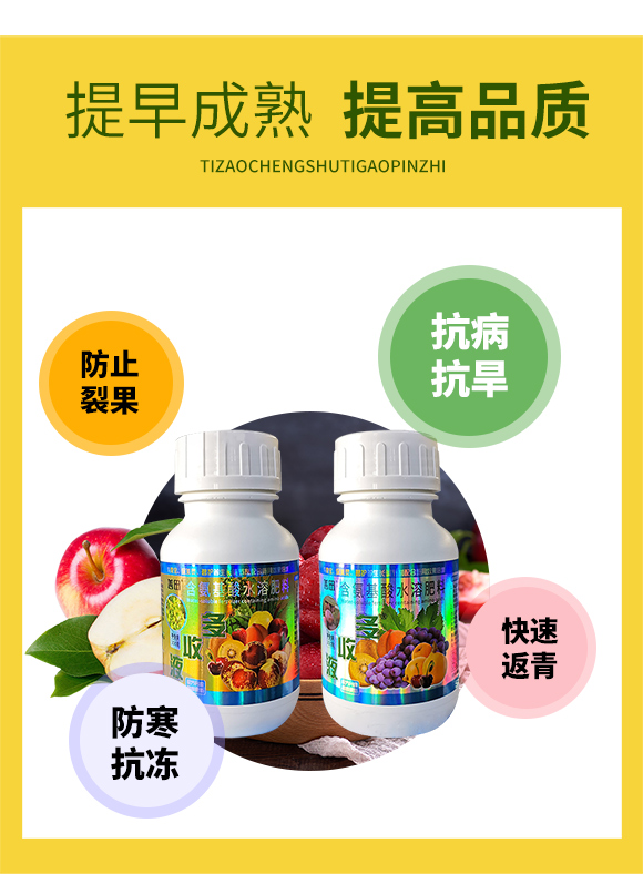 本品應用現(xiàn)代生物工程技術,采用純生物發(fā)酵有機成品,以十七種氨基酸與天然生物活性物、優(yōu)質高效鰲合態(tài)植物必需微(常)量元素以及作物基因表達促進物質按一定比例螯合,該產品生物效價高、功能強、吸收利用率高且特別迅速,其活性是一般葉面肥的8-10倍;能增強植物體內多種酶及內源激素的生成激活,提高同化與光合作用,增強細胞活力,打破種子休眠、促進生根、提高出苗率、壯苗、快速返青。;ū9⑴虼蠊麑、增強著色、防止裂果、提早成熟,大幅度提高品質,預防植株衰老、抗病、抗旱、防寒抗凍,使受害作物迅速恢復弱勢生機,減少病蟲危害,增產10-15%,是開發(fā)綠色、無公害、有機食品與發(fā)展高效生態(tài)農業(yè)的產品。