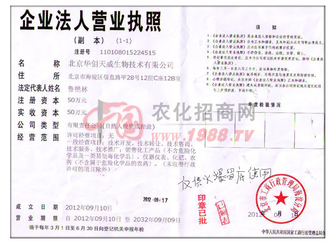 北京華創(chuàng)天威生物技術(shù)有限公司是北京高新技術(shù)企業(yè),由農(nóng)科院、農(nóng)業(yè)大學、專家、教授和經(jīng)驗豐富的實戰(zhàn)專家家定點農(nóng)藥生產(chǎn)企業(yè)組建而成,公司秉承:誠信,創(chuàng)新,快捷,克勝的經(jīng)營方針,堅持以開發(fā)推廣市場市場潮流的新成分,新劑型,高含量的產(chǎn)品為公司發(fā)展方向,始終以的經(jīng)營模式經(jīng)銷商在殘酷市場中快速發(fā)展,為中國農(nóng)業(yè)豐產(chǎn)、豐收而努力奮斗。
