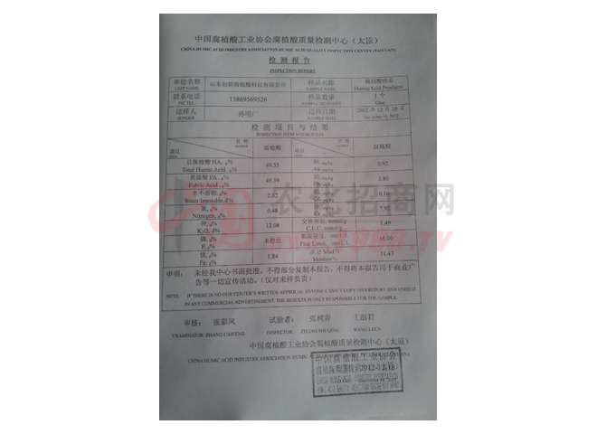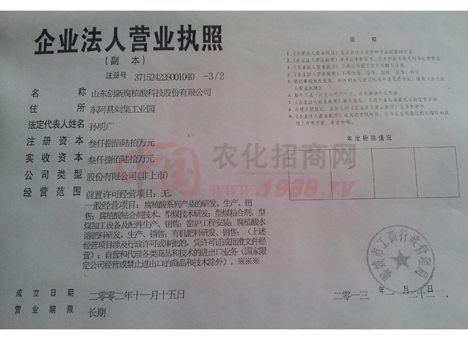 山東創(chuàng)新腐植酸科技股份有限公司是一家專業(yè)從事腐植酸礦山開采,腐植酸系列產(chǎn)品研發(fā)、生產(chǎn)的股份制國家高新技術(shù)企業(yè)。企業(yè)創(chuàng)立于2002年,位于中國阿膠文化和佛樂文化的發(fā)源地——山東省東阿縣,注冊資金3860萬元,凈資產(chǎn)8000多萬元。企業(yè)是中國腐植酸工業(yè)協(xié)會副理事長單位,2010年獲全國腐植酸烏金杯獎。已獲三項發(fā)明專利、兩項實用新型專利授權(quán)。已通過ISO9001質(zhì)量管理體系認(rèn)證和ISO14001環(huán)境管理體系認(rèn)證,是山東省環(huán)保產(chǎn)業(yè)骨干企業(yè),公司被山東省科委認(rèn)定為山東省腐植酸工程技術(shù)研究中心,2010年獲國家科技進(jìn)步二等獎。