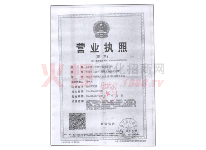 山東貴合生物科技有限公司始建于2005年7月,位于陽(yáng)谷縣阿城鎮(zhèn)工業(yè)園,占地面積11988平方 米,房屋建筑面積3782平方米。公司注冊(cè)資金1000萬(wàn)元,為有限責(zé)任公司,經(jīng)營(yíng)范圍為生產(chǎn)、 銷(xiāo)售農(nóng)藥,年設(shè)計(jì)生產(chǎn)能力1000噸。主要從事以殺蟲(chóng)、殺菌劑為主的農(nóng)化產(chǎn)品的研發(fā)、生產(chǎn)與 銷(xiāo)售。