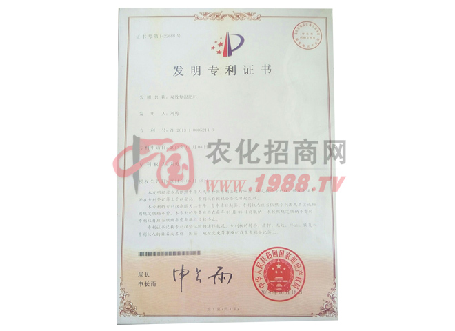 本公司科研人員歷經(jīng)五年研制的“雙效復(fù)合肥”已申請國家專利,申請?zhí)枮椋?00810079499.4。“雙效復(fù)合肥”中配制有土壤殺菌劑,對玉米粗縮病、小麥全蝕病、赤霞病、白粉病、花生落葉病、棉花枯黃萎病及各種農(nóng)作物的死菌爛根有較好防治作用,真是號稱:“一肥雙效,能治病的好肥料”。