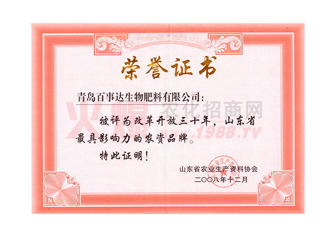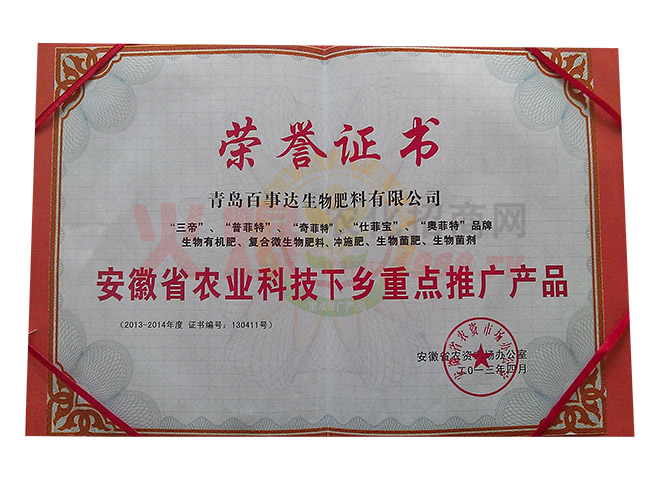 經(jīng)多年、多地的實(shí)踐證明,公司生產(chǎn)的“側(cè)孢短芽孢桿菌”系列生物肥料,適應(yīng)性廣、使用效果顯著。菌種活性高、穩(wěn)定性強(qiáng)、繁殖快,在改良土壤、增強(qiáng)作物抗病性、改善作物品質(zhì)、提高作物產(chǎn)量,增加經(jīng)濟(jì)效益等方面,都走在了行業(yè)的前面。公司產(chǎn)品相繼被評(píng)為山東省“改革開放30年放心農(nóng)資品牌”、安徽省“農(nóng)業(yè)科技下鄉(xiāng)重點(diǎn)推廣產(chǎn)品”、安徽省“生態(tài)種植高產(chǎn)創(chuàng)建主推產(chǎn)品”,中華全國(guó)供銷總社科技推廣中心“重點(diǎn)推廣農(nóng)資產(chǎn)品”、中華全國(guó)供銷總社科技推廣中心“合作推廣品牌”、中國(guó)質(zhì)量萬(wàn)里行“國(guó)家監(jiān)督檢查產(chǎn)品質(zhì)量穩(wěn)定合格品牌”、中國(guó)國(guó)家綠色食品發(fā)展中心“綠色食品生產(chǎn)資料”。中央電視臺(tái)“上榜品牌”,被廣大用戶譽(yù)為生物肥效果。