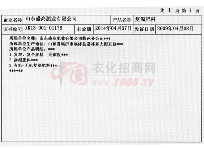證書(shū)名稱:肥料正式登記證 發(fā)證機(jī)構(gòu):山東省農(nóng)業(yè)廳