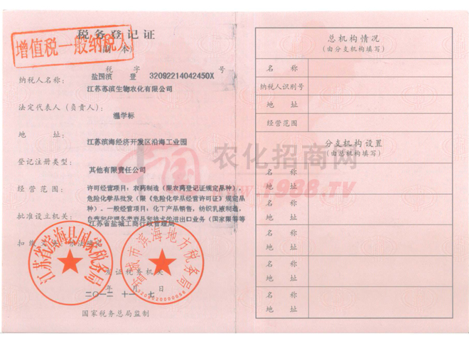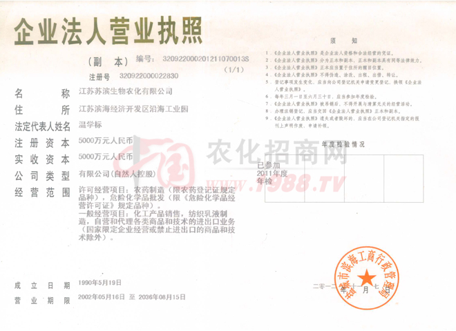 企業(yè)創(chuàng)建于1995年,是國家農藥定點生產企業(yè),主要從事原藥合成,制劑加工復配,主產品“蘇濱”牌“豐之源”、“禁紋”由中國農業(yè)大學植物生態(tài)工程研究所研制,系國家星火計劃項目,被評為鹽城市產品,產品銷售網絡覆蓋全國十多個省市。現(xiàn)擁有資產13000萬元,注冊資金5000萬元,占地面積70000㎡,建筑面積14800㎡,職工128人,其中專業(yè)技術人員43人,2012年銷售2億元,利稅達3000萬元。