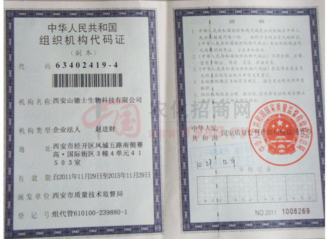 證書名稱:組織機構代碼證 發(fā)證機構:中華人民共和國國家質量監(jiān)督檢驗檢疫總局