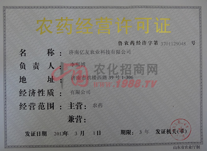 濟(jì)南億友農(nóng)業(yè)科技有限公司成立于2006年12月6日,公司前身是山東大學(xué)科貝爾生物工程有限公司(濟(jì)南金科生化有限公司)的研發(fā)中心,2009年經(jīng)過(guò)重組改成了股份制公司。公司現(xiàn)擁有資深農(nóng)業(yè)專(zhuān)家2名,農(nóng)藥化工高級(jí)工程師、化學(xué)博士指導(dǎo)數(shù)名,研究生數(shù)名,技術(shù)力量雄厚。公司目前主推佳圣®牌、億友嘉田®牌,科巧®套餐系列30%毒死蜱微膠囊懸浮劑花生、土豆、大蒜拌種劑系列,以及蘇寬®,百凈®,全奪®(8000iu/ul蘇云金桿菌懸浮劑)全能殺蟲(chóng)劑系列,其具有性高、持效期長(zhǎng)、殺蟲(chóng)譜廣等特點(diǎn),公司近還推出了蘇線丹®等高效低毒殺蟲(chóng)、殺線蟲(chóng)劑等產(chǎn)品,好產(chǎn)品不斷推出中,公司法人李熙博竭誠(chéng)歡迎您的到來(lái)。