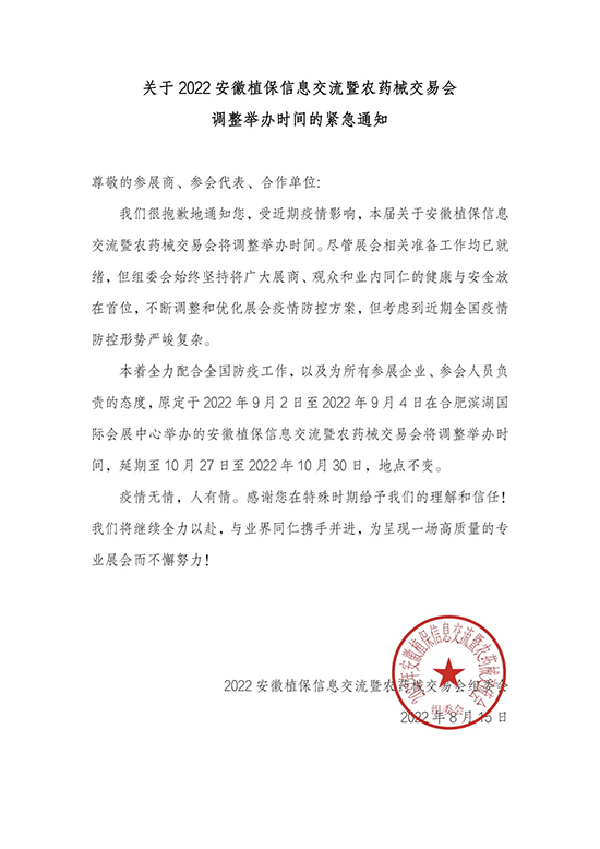 關(guān)于2022安徽植保信息交流暨農(nóng)藥械交易會調(diào)整舉辦時間的緊急通知